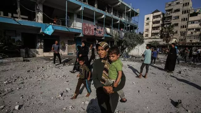 Palästinenser begutachten die Schäden nach einem israelischen Angriff auf eine vom UN-Palästinenserhilfswerk UNRWA betriebene Schule im Flüchtlingslager Nuseirat. / Foto: Omar Naaman/dpa